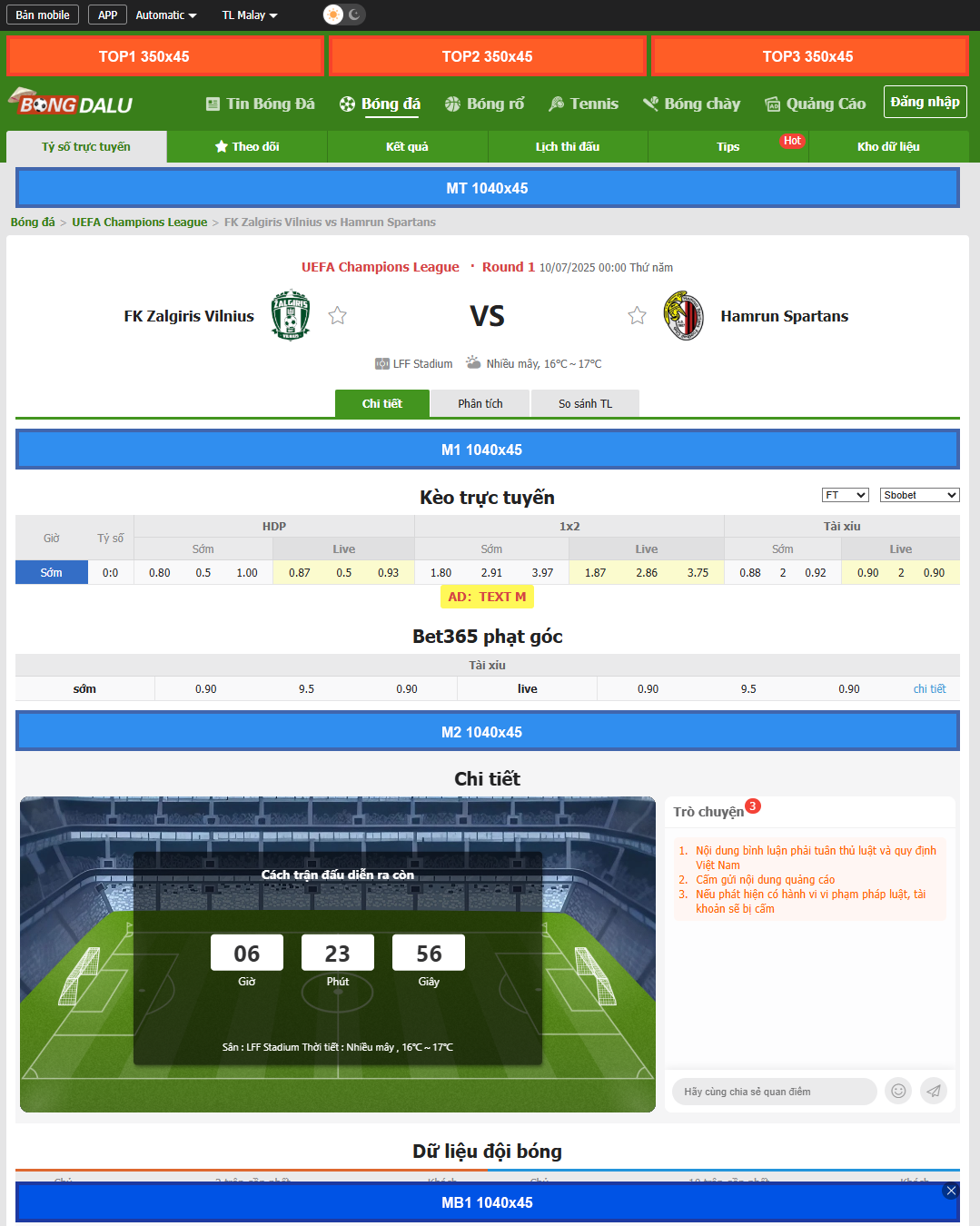 Bongdalu809.com là một website chuyên cập nhật tỷ số trực tuyến bóng đá nhanh và chính xác nhất tại Việt Nam. Ở đây, bạn có thể theo dõi tất cả các thông tin như tỷ số trực tuyến, TL trực tuyến, kết quả, lịch thi đấu, bảng xếp hạng, kho dữ liệu hay nhận định của các giải đấu bóng đá/bóng rổ/tennis/bóng bầu dục.